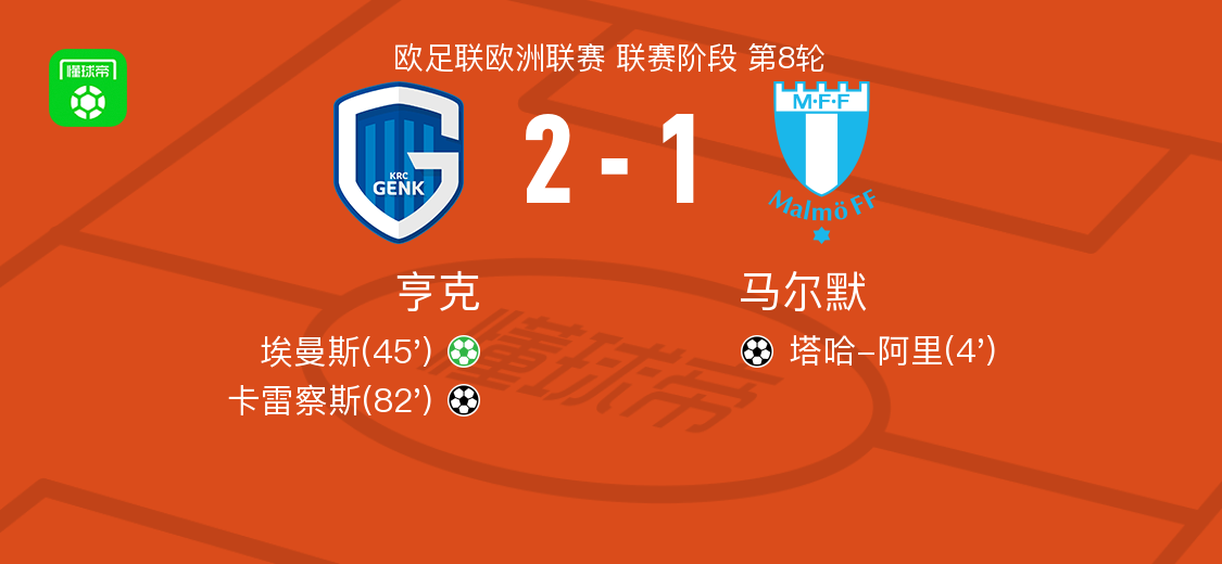 北京时间1月30日欧足联欧洲联赛 联赛阶段 第8轮,亨克对阵马尔默。亨克埃曼斯破门,卡雷察斯破门。马尔默塔哈-阿里破门。最终比分亨克 2-1 马尔默。