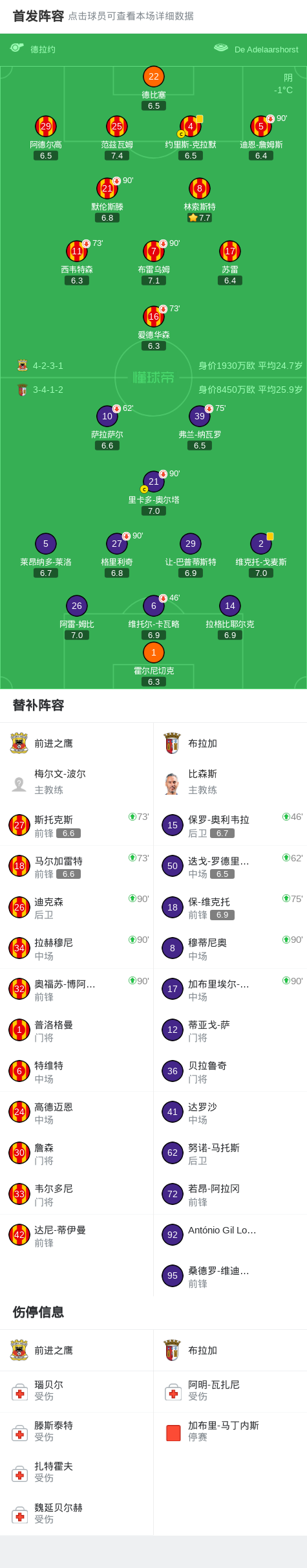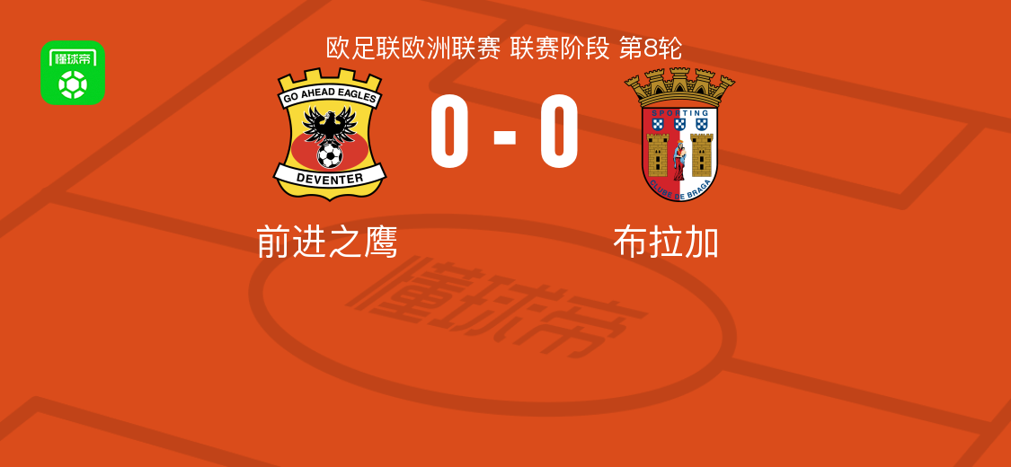 北京时间1月30日欧足联欧洲联赛 联赛阶段 第8轮,前进之鹰对阵布拉加。最终比分前进之鹰 0-0 布拉加。