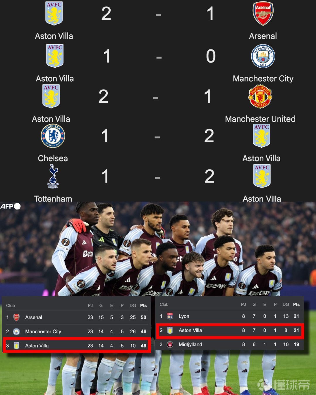 请全体起立,为阿斯顿维拉献上掌声!他们本赛季至今的表现: ✅ 稳居英超联赛前三名 ✅ 正直接争夺英超冠军 ✅ 欧联杯小组赛挺进前三 ✅ 直通欧联杯十六强淘汰赛 ✅ 晋级足总杯第四轮 ✅ 已击败阿森纳 ✅ 已击败曼城 ✅ 已击败曼联 ✅ 已击败切尔西 ✅ 已击败热刺 他们屡克强敌,正在角逐世界顶级的联赛冠军;欧联杯8场取得7胜;进入二月仍保持三项赛事的争冠可能!埃梅里打造了一支多么出色的球队。 英超乃至全英伦的热门焦点!