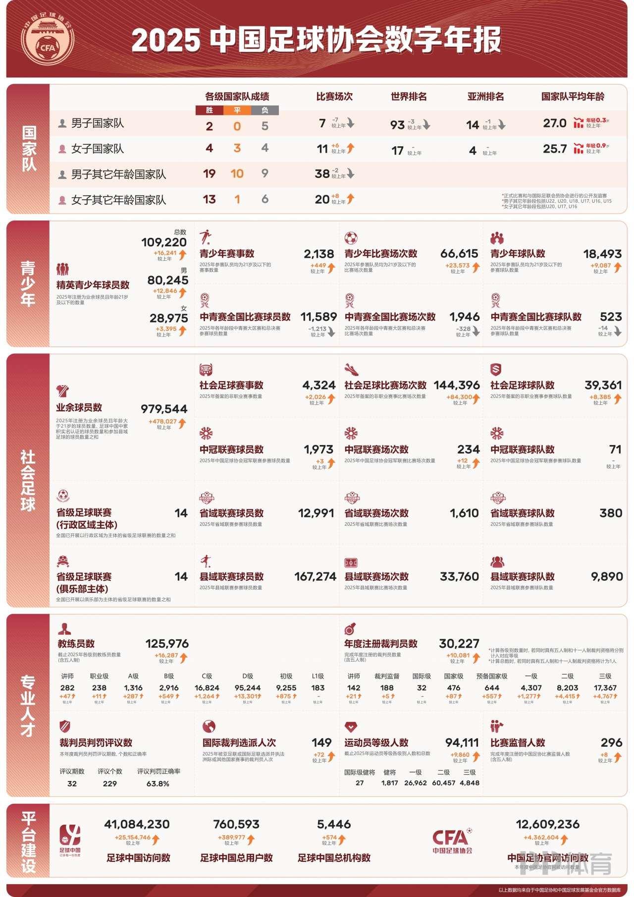 中国足协发布2025年中国足球协会数字年报,其中国家队建设板块的数据如下。