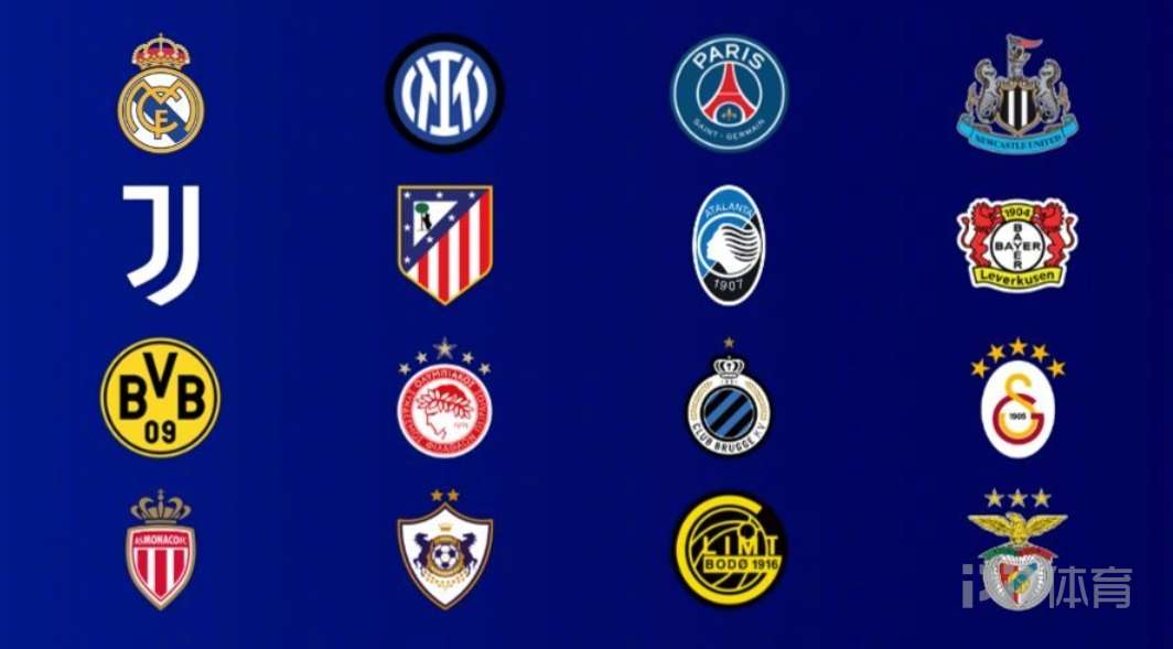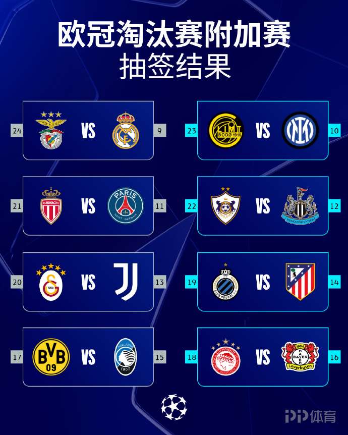 第9-16名球队为种子队:皇家马德里、国际米兰、巴黎圣日耳曼、纽卡斯尔联、尤文图斯、马德里竞技、亚特兰大、勒沃库森
