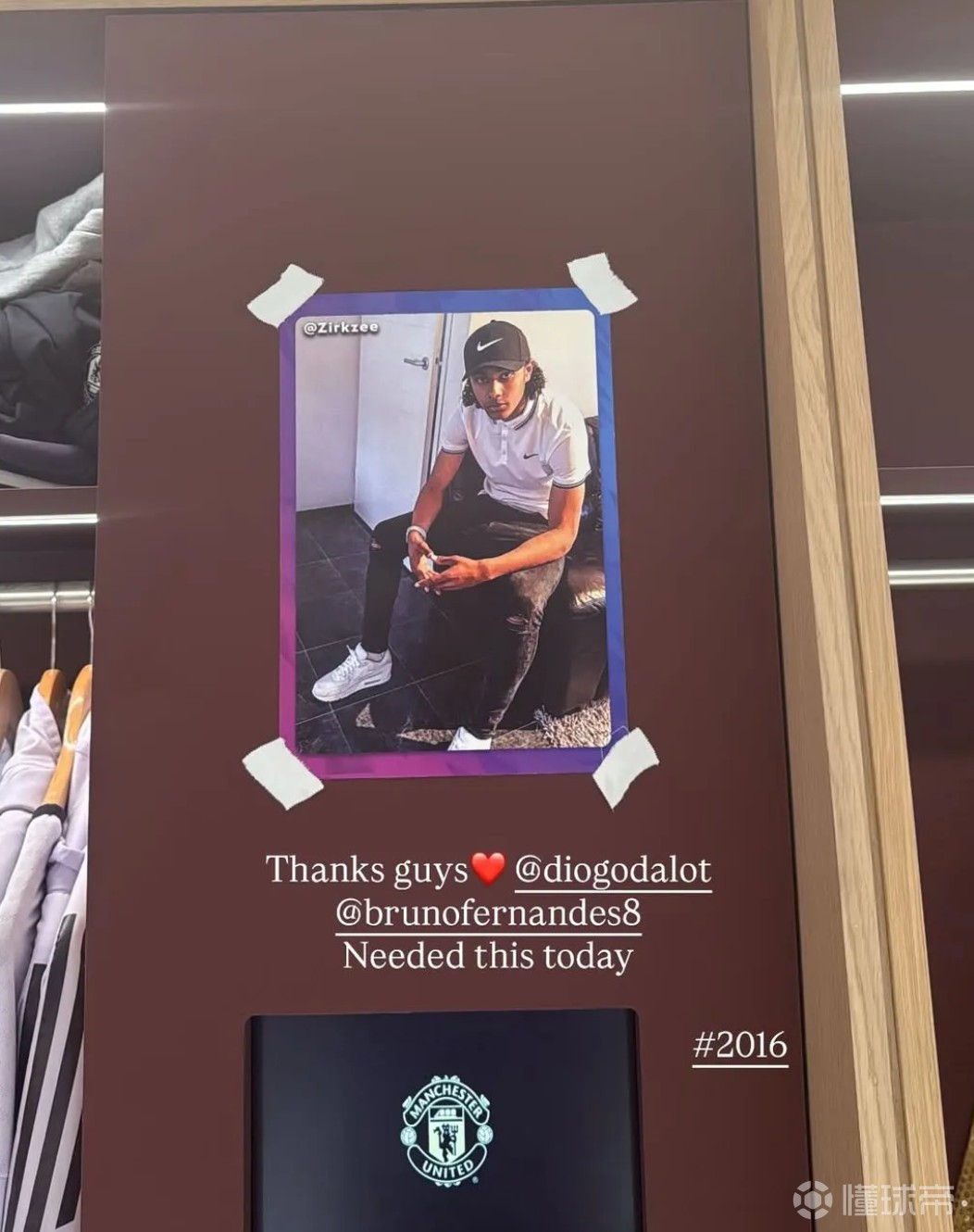 照片就贴在齐尔克泽更衣柜旁的墙上,看起来是在更衣室里他的位置旁边。