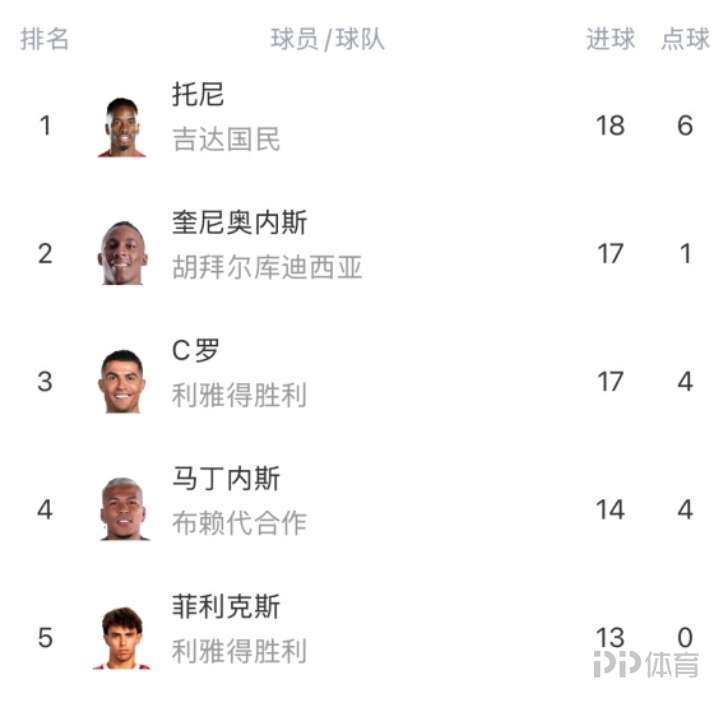本赛季沙特联第19轮战罢,目前的射手榜上,伊万·托尼18球居首,奎尼奥内斯和C罗以17球并列第二。