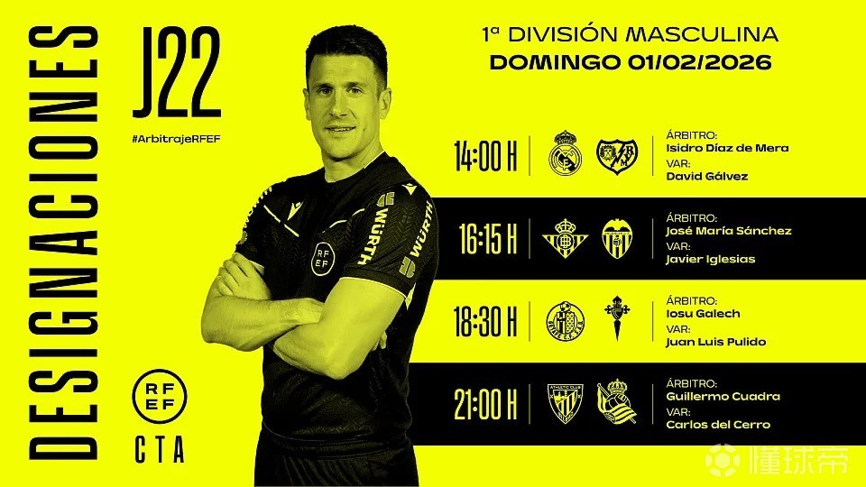 西班牙足协官方公布了周日西甲四场比赛的裁判安排,迪亚斯-德梅拉将执法皇马vs巴列卡诺。