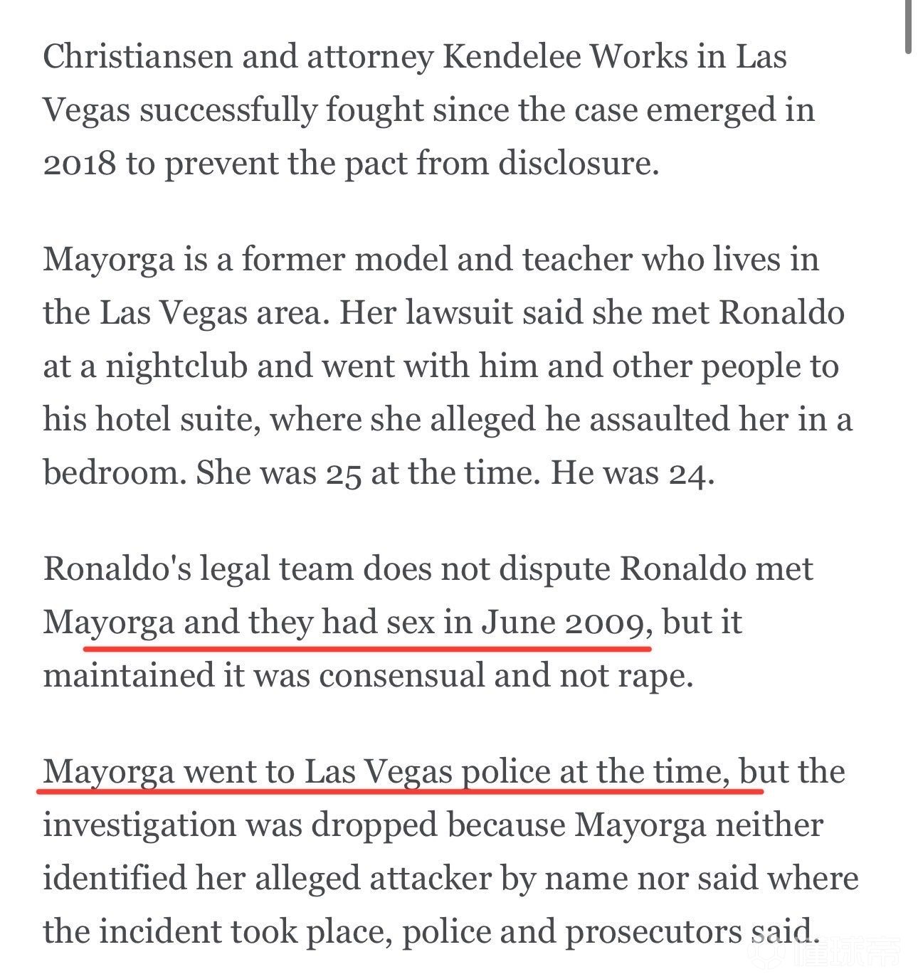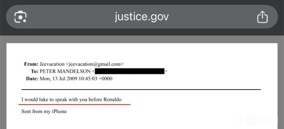 外媒新闻:据称,C罗纳尔多2009年6月在拉斯维加斯涉嫌强奸凯瑟琳·马约尔加后,曼德尔森勋爵可能借助爱泼斯坦的帮助,促成并安排了凯瑟琳签署保密协议与和解协议。 2009年7月13日爱泼斯坦致曼德尔森的邮件中写道:"我想在联系C罗纳尔多前先与你沟通" 相关文件于2010年签署,并完成32.5万美元的财务支付。 值得注意的是,此事恰逢C罗纳尔多转会皇家马德里的前夕,而曼德尔森同年夏季曾"代理管理国家(指英国)"一周。 这些事件的时间点存在诡异的同步性。