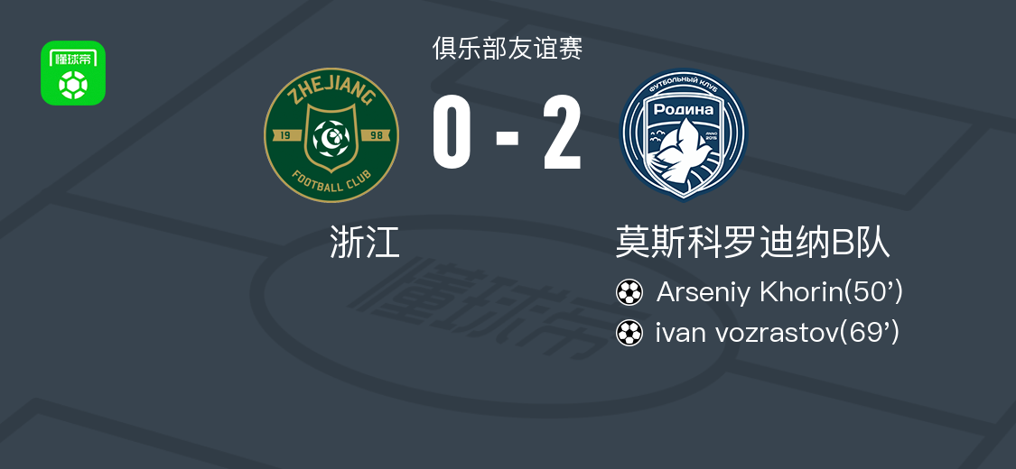 北京时间1月31日俱乐部友谊赛,浙江对阵莫斯科罗迪纳B队。莫斯科罗迪纳B队Arseniy Khorin破门,ivan vozrastov破门。最终比分浙江 0-2 莫斯科罗迪纳B队。