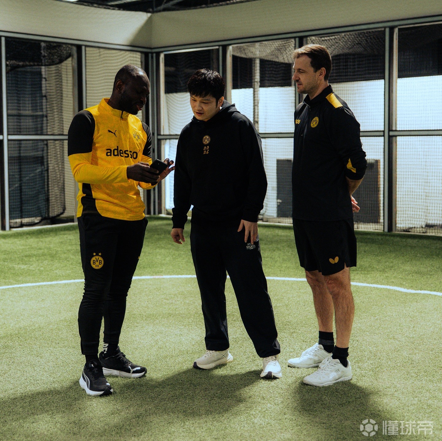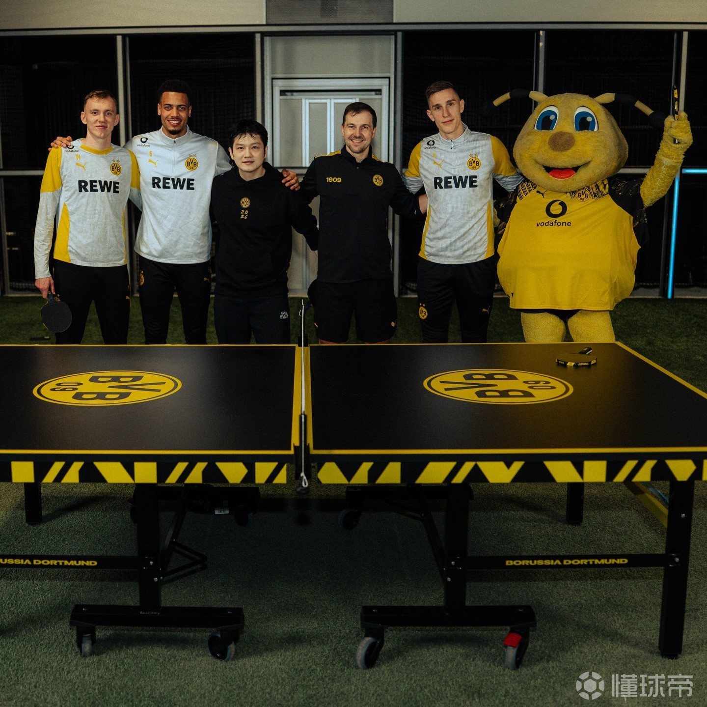 除了在看台上观赛,两位乒坛名将还走进场内,与多特蒙德球员展开了轻松有趣的互动。多特官方社交媒体随后发布了相关画面,照片中,樊振东和波尔分别与施洛特贝克、恩梅加、拜尔等球员一起打乒乓球、踢足球,跨项目交流氛围十分融洽。