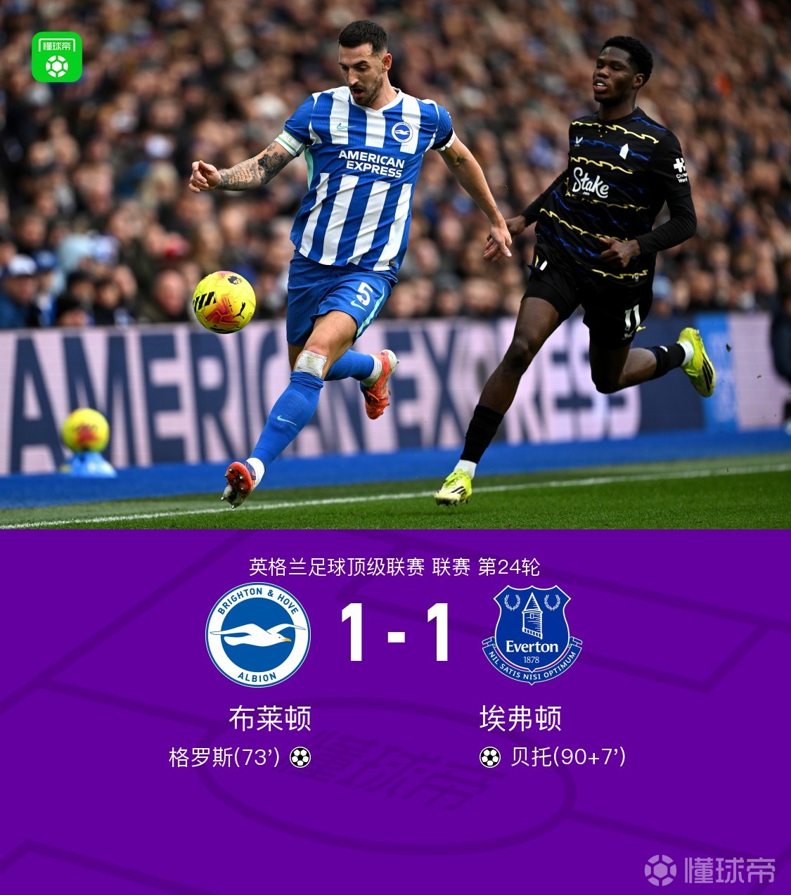 北京时间1月31日,英格兰足球顶级联赛第24轮,布莱顿主场对阵埃弗顿。比赛中,格罗斯打破僵局,贝托补射读秒绝平。最终,布莱顿1-1埃弗顿。
