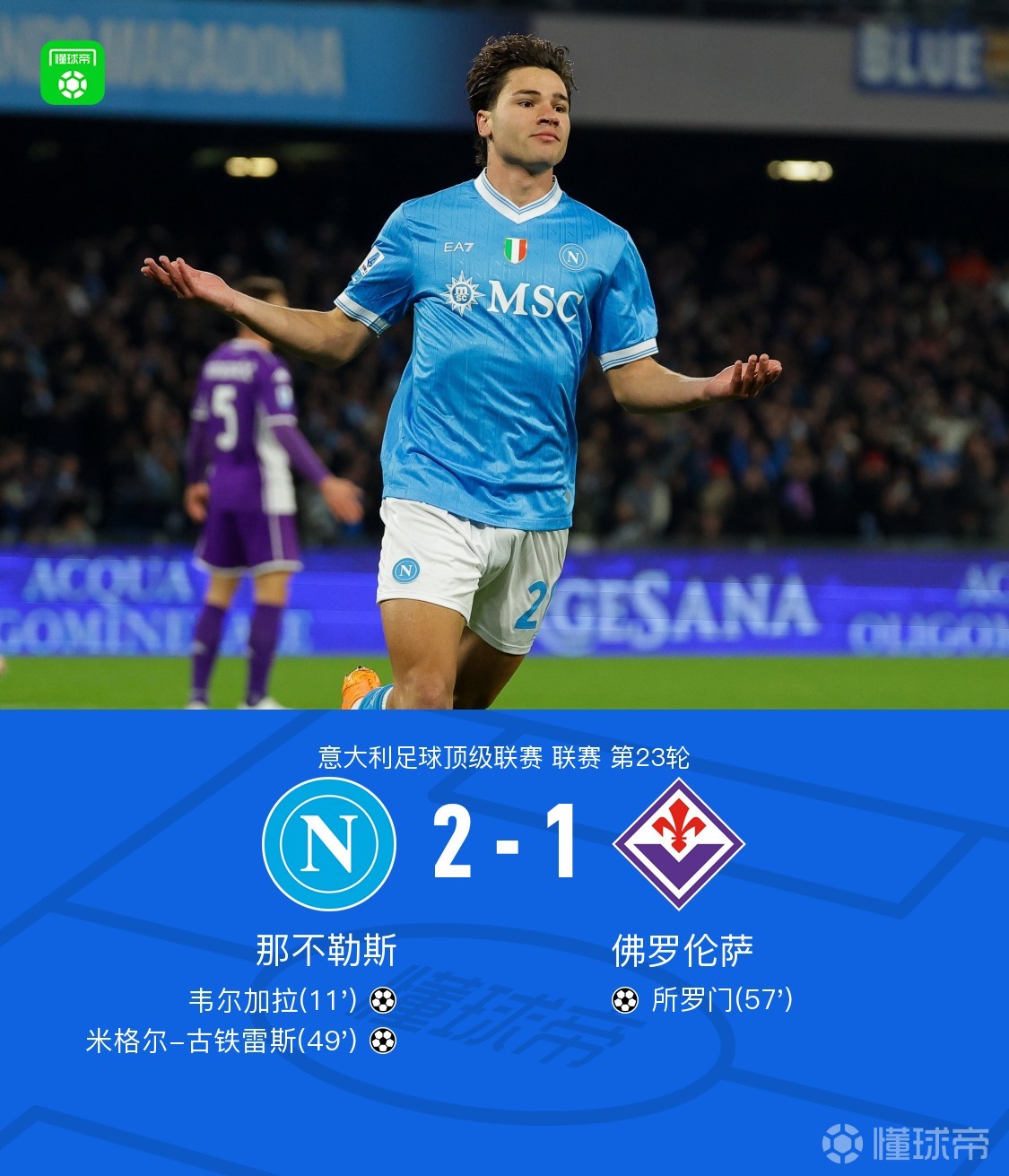 北京时间2月1日意大利足球顶级联赛第23轮,那不勒斯主场对阵佛罗伦萨。上半场,韦尔加拉单刀冷静破门。下半场,古铁雷斯禁区内兜射,扩大优势,随后,所罗门门前补射进球,扳回一城。最终比分那不勒斯 2-1 佛罗伦萨。