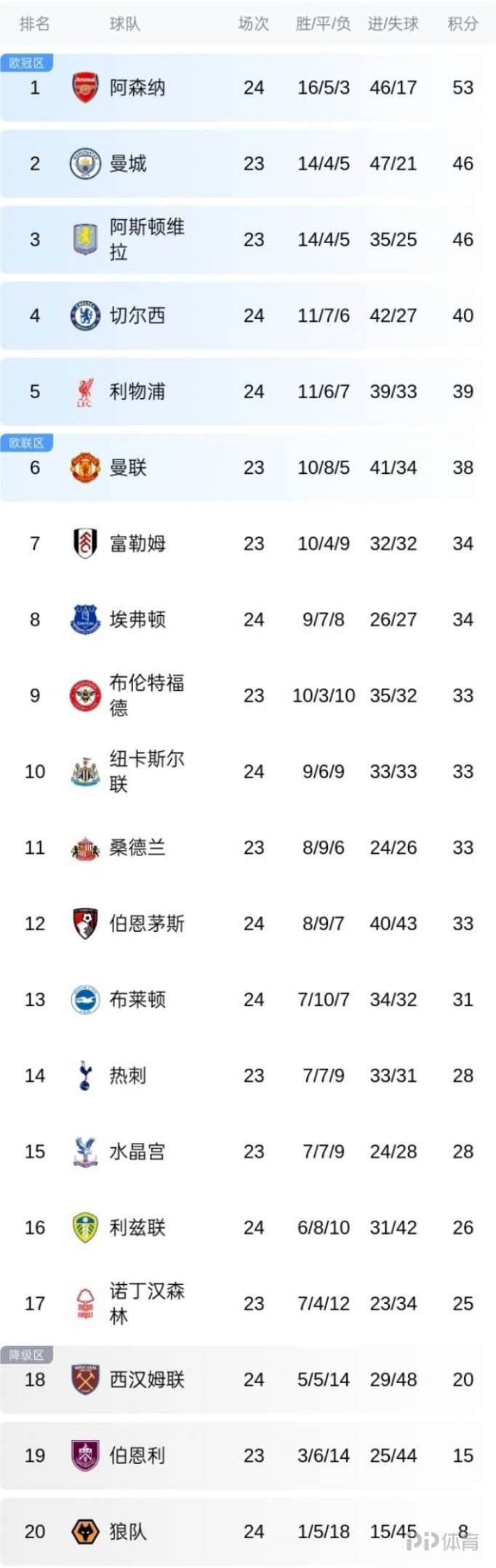 积分榜上,阿森纳先赛7分领跑,切尔西联赛三连胜后暂升第4,利物浦终结5轮不胜暂升第5。