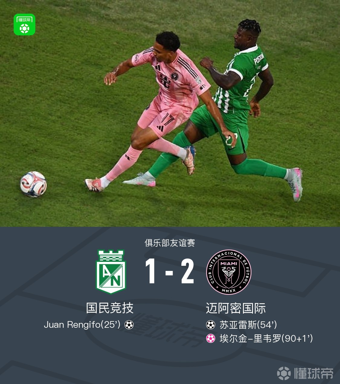 北京时间2月1日俱乐部友谊赛,国民竞技对阵迈阿密国际。国民竞技胡安-伦吉福破门。迈阿密国际苏亚雷斯破门。埃尔金-里韦罗不慎自摆乌龙。最终,迈阿密国际2-1逆转国民竞技。